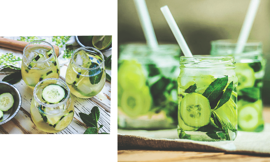 Смешай огурец и сок лайма в блендере и перелей смесь в бокалы со льдом. Добавь кусочки лайма, мяту, сахар и содовую перед подачей. Укрась края бокала солью.