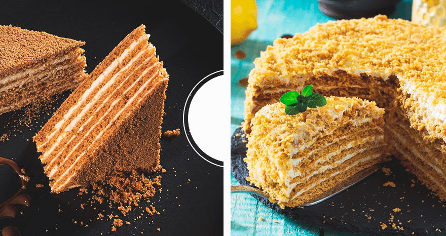 Например, в Америке медовик называют Russian honey cake. Торт там готовят на основе меда и карамели, а вот вместо сгущенки используют взбитые сливки со сметаной, сахаром и ванилью.