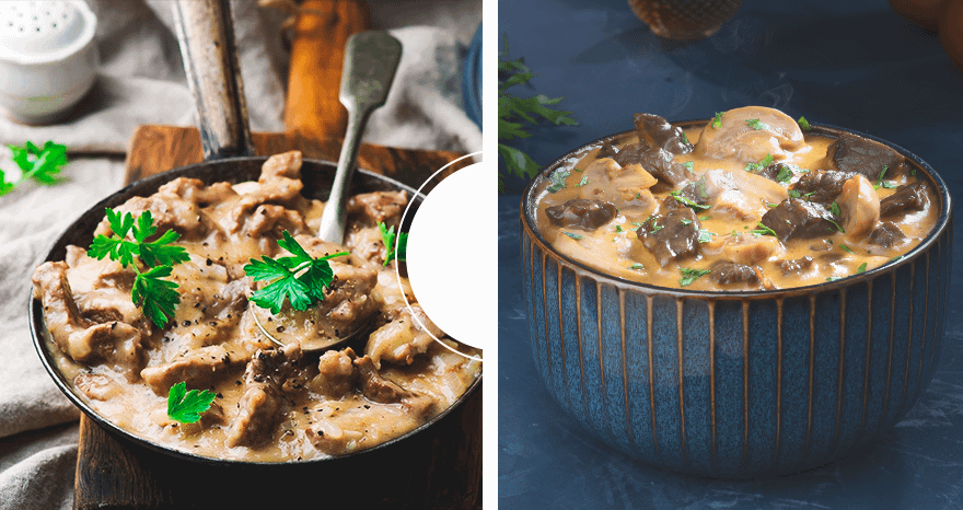 Это популярное во всем мире блюдо русской кухни готовится из мелко нарезанных кусочков говядины с соусом. Первый рецепт бефстроганова был напечатан еще в 1871 году в книге Елены Молоховец «Подарок молодым хозяйкам». С тех пор мясное блюдо готовят и подают как в элитных ресторанах, так и на более скромных кухнях.