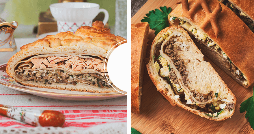 Еще одно традиционное старорусское блюдо особенно популярно во Франции. Кулебяка — это закрытый пирог с разнообразной начинкой, приготовленный из дрожжевого теста. В России это блюдо состоит из нескольких видов разной начинки, которая отделяется друг от друга тонкими блинчиками.