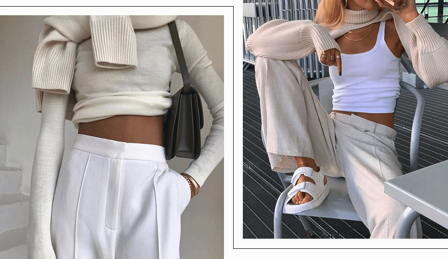 Не менее востребованной считается кипенно-белая одежда. Ее можно сочетать как с базовым черным или серым, так и с более сложными оттенками. Но вот в одном образе с одеждой бежевого цвета белые вещи выглядят не очень удачно. Так как эти цвета имеют разную температуру, аутфит не выглядит гармонично, а цвет кожи может визуально измениться и приобрести болезненный желтоватый оттенок.