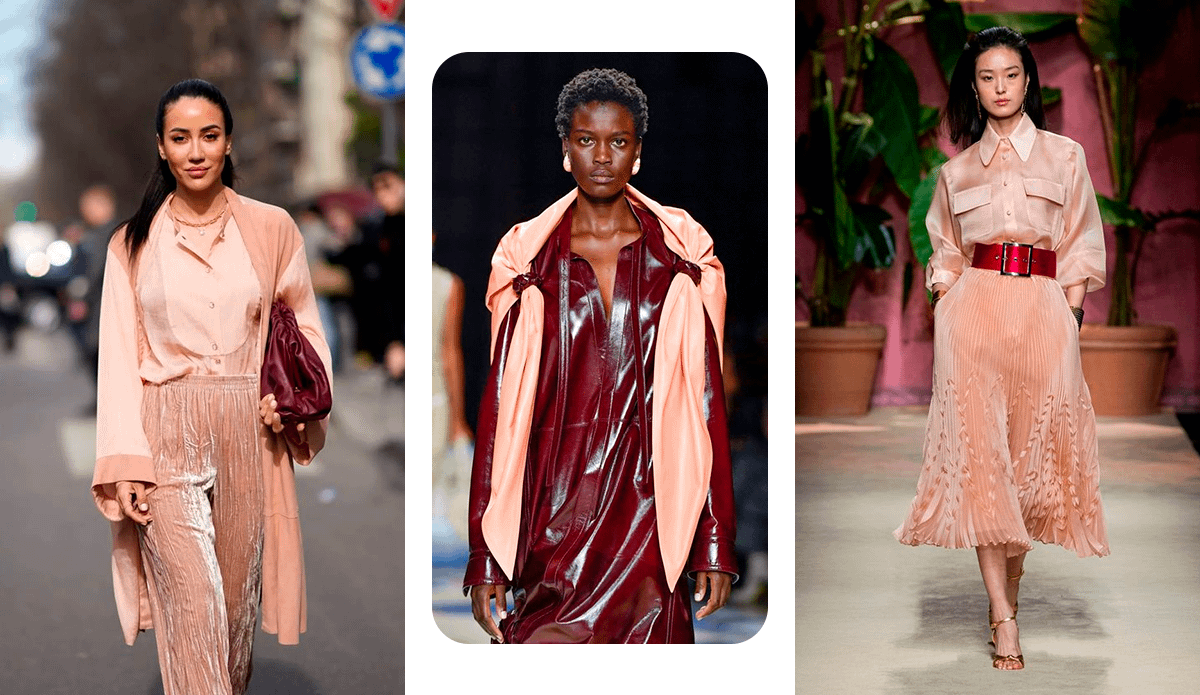Два сложных оттенка идеально дополняют друг друга. Бургундский сочетает в себе коричневый и темно-красный, а персиковый — розовый и оранжевый. Образ получится загадочным, но при этом женственным. Используй плотные ткани, чтобы создать лук в стиле old money.