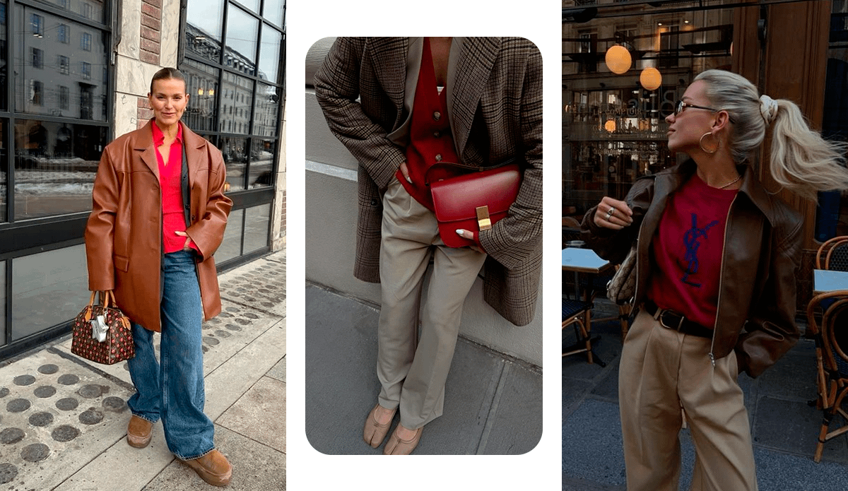 Сочетание этих цветов в одежде некоторые считают неудачным, так как в цветовом круге Иттена красный и коричневый находятся рядом и носить их вместе не рекомендуется. Но тренды часто не соответствуют стандартным представлениям о моде, и если готова к экспериментам, то дерзай.