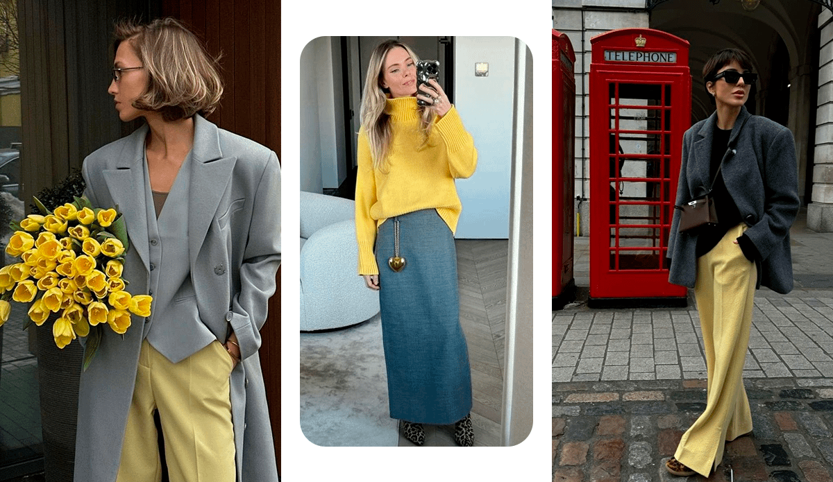 Один из главных цветов 2024 года по версии Pantone — канареечно-желтый. Однотонные аутфиты в этом оттенке выглядят очень ярко, поэтому на их создание решается не каждая. Если тебе нравится этот оттенок в одежде, сочетай его с серым. Он «успокоит» образ и сделает его универсальным.