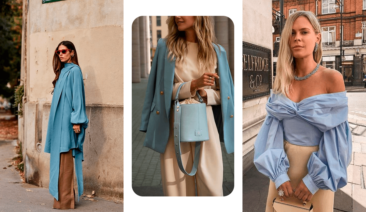 Совет: если образ в голубом и бежевом оттенке кажется тебе скучным, используй вещи необычного кроя, акцентные аксессуары или цветную обувь.