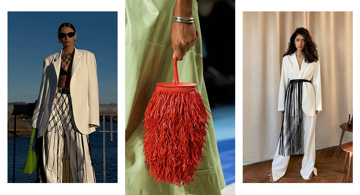 Не знаешь, с чего начать знакомство с трендом? Купи пояс с длинной бахромой и используй его вместо ремня в образе с базовым костюмом. Также можешь примерить полупрозрачную плетеную накидку, дополненную бахромой. Обычно вещь надевают поверх белых блузок или прямо на голое тело, под жакет.