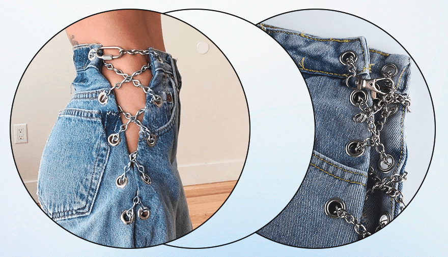 Если любимые джинсы стали малы в талии и бедрах, это еще не повод выбрасывать их. Ты можешь сделать из них то, что сейчас на пике популярности — необычные модели с цепочками-вставками по бокам.