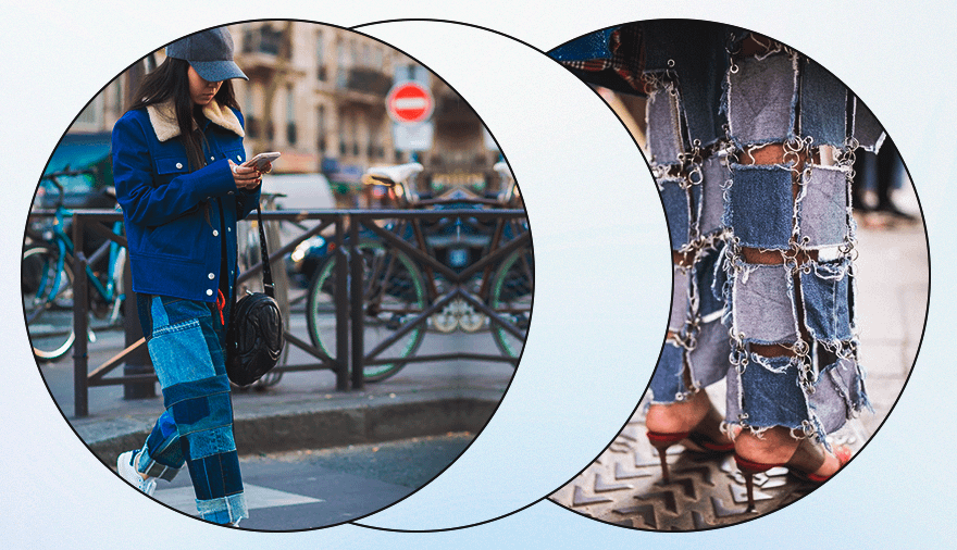 Один из трендов конца 70-х, вновь вернувшийся в этом году — пэчворк из денима и другой плотной ткани. Например, если у тебя есть двое-трое джинсов, которые не сходятся на талии, можешь сшить из них одну необычную пару штанов, которая станет акцентной вещью в любом образе.