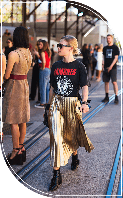 Сочетать плиссированные макси-юбки рекомендуем в одном образе с яркой футболкой или кардиганом. Особенно актуальны модели с принтами в стиле гранж. Идеально в такой образ вписываются грубая обувь, винтажные очки и массивные украшения.