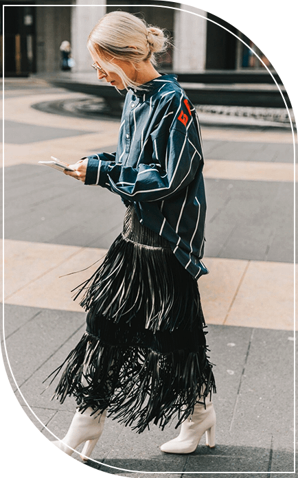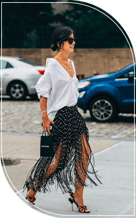 Бахрома — еще один бесспорный тренд этого лета. Одежда, украшенная бахромой, отсылает к стилю хиппи и позволяет создать расслабленные стильные образы для жаркого лета. В тренде не только платья и блузки с бахромой, но и удлиненные юбки. Их звезды стритстайла предпочитают носить в одном образе с базовыми белыми рубашками и лонгсливами. Актуальны как однотонные юбки с бахромой из тонких материалов, так и вязаные и кожаные модели.