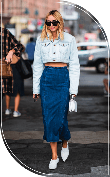 Total denim — один из главных модных трендов этого лета. При этом сочетать между собой дизайнеры рекомендуют деним разных оттенков и плотности. Так, если ты приобрела джинсовую юбку макси, сочетай ее в одном образе с укороченной джинсовой курткой или рубашкой.