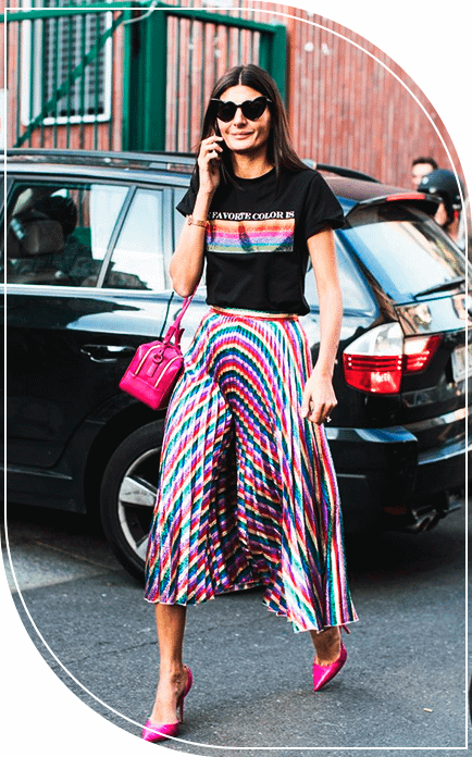 6. Плиссированная юбка макси в сочетании с футболкой с принтом