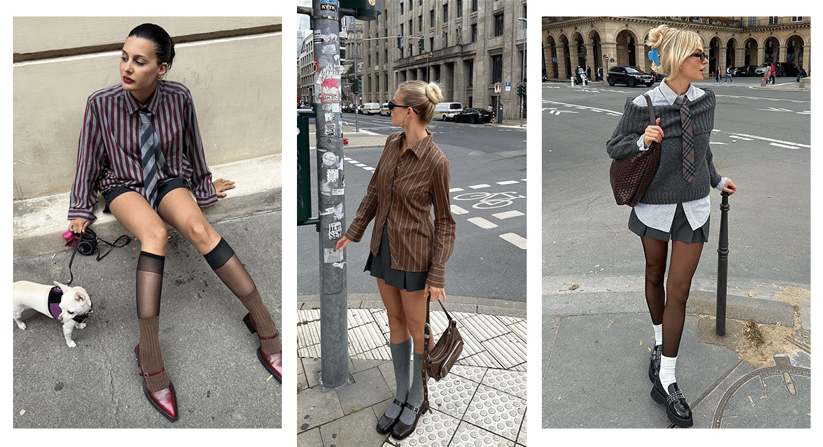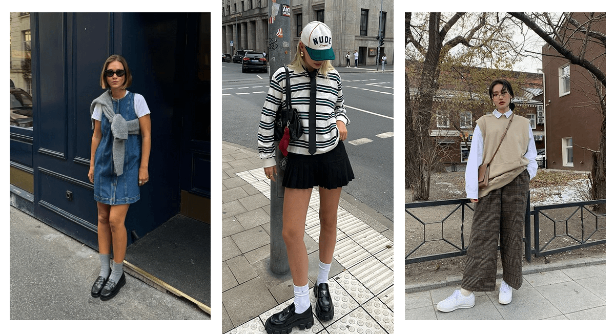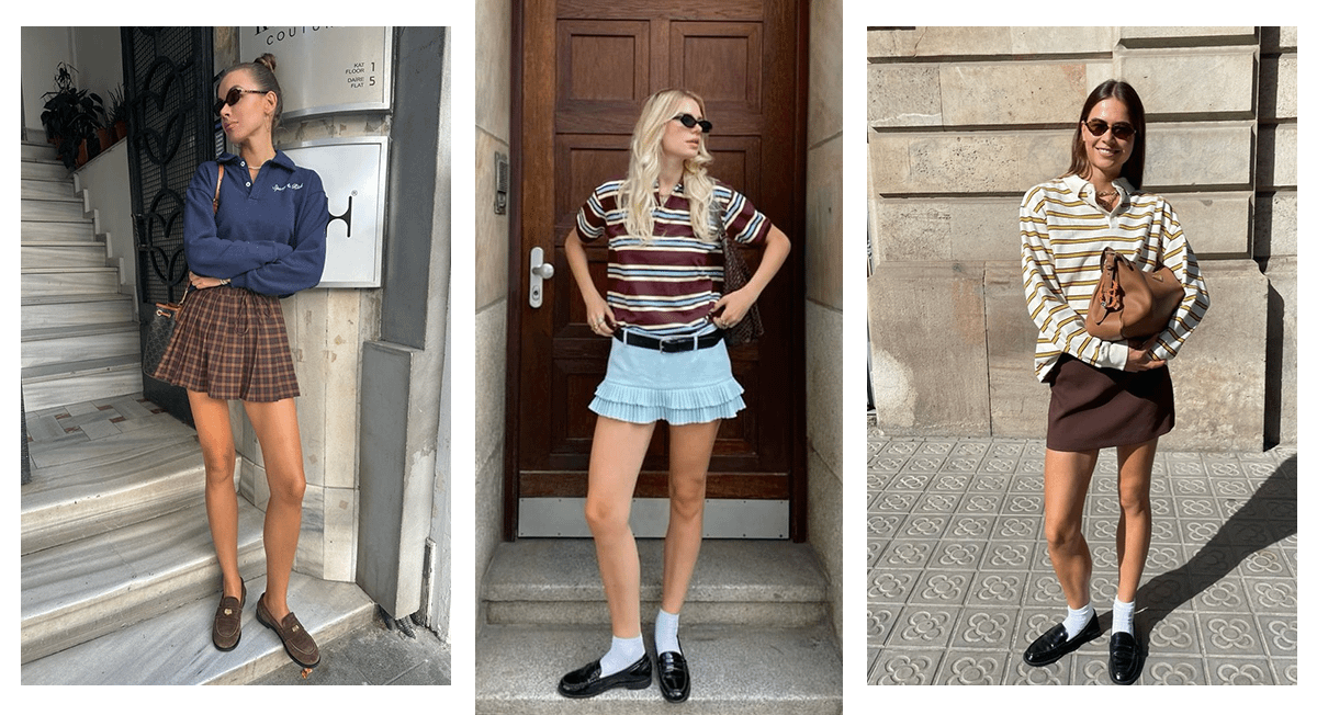 Если пытаешься прийти к балансу, надень мини-юбку и поло с длинными рукавами. Вещи могут быть как в базовых коричнево-бежевых оттенках, так и в более ярких. Лоферы советуем использовать темно-коричневые или черные.