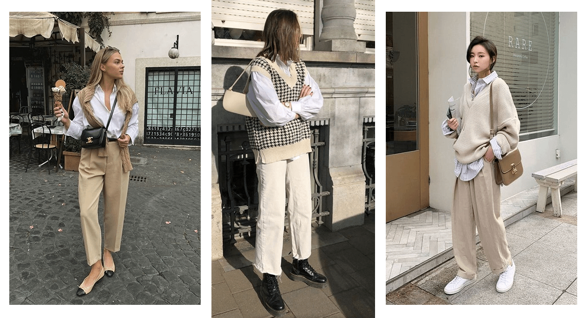 Присмотрись к бежевым брюкам или джинсам — они должны быть не слишком короткими, довольно широкими и из качественного материала. Также в качестве первого слоя используй белую или нежно-голубую рубашку свободного кроя. Поверх нее надень жилет без рукавов или кофту с V-образным вырезом. Не забудь о сумке кросс-боди, удобных кедах и крабике для волос.