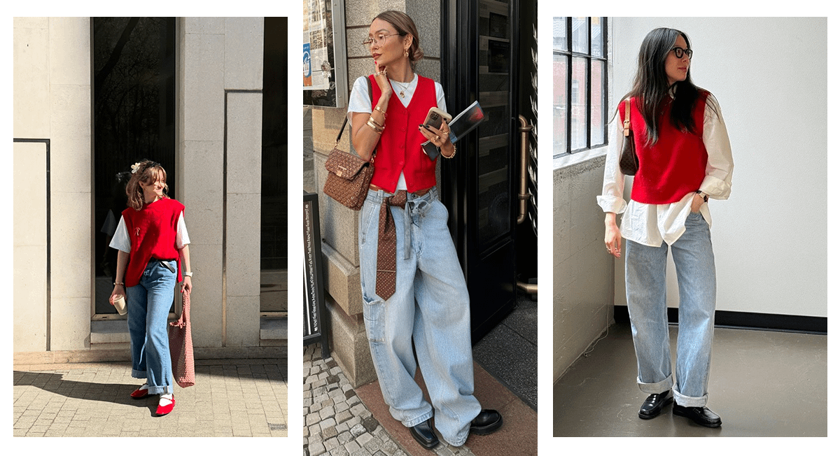 В первую очередь советуем купить голубые джинсы прямого кроя, однотонную хлопковую футболку и красный жилет — он сделает обычный лук более интересным. Если захочется усложнить образ, сможешь быстро надеть яркие украшения, схватить сумку багет и солнцезащитные очки с широкой оправой.