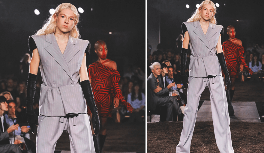 Сила духа проявлялась и в наряде, в котором предстала Шафер. Лавандовый костюм-двойка в полоску, жакет которого дополнен массивными наплечниками, оперные перчатки из кожи и ботинки на высокой платформе. Они олицетворяли власть, контроль над ситуацией и грубость, и их не скроет даже хрупкий образ модели.