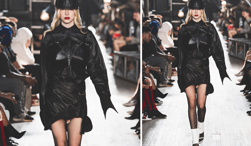 Шафер могла бы появиться в криминальной драме: так хорош оказался ее тотал блэк образ, дополненный контрастной обувью. Жокейская кепи, рубашка, бра, асимметричная юбка, открытые сапоги — и все из кожи.