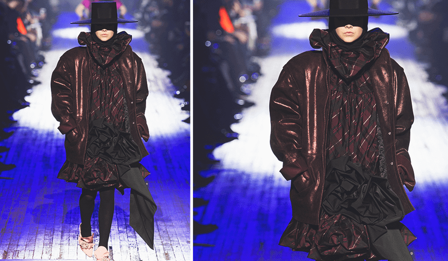 Габаритные пальто, длинные палантины, массивные кожаные плащи, гигантские шляпы, а также дань королям кутюра 80-х: Тьерри Мюглеру, Иву Сен-Лорану и Эмануэлю Унгаро. Хантер Шафер тут тоже была, правда, ее оказалось трудно разглядеть под сливовым жакетом с эффектом металлик и черным головным убором.