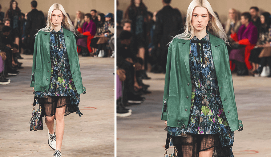 Шафер предстала на подиуме в бирюзовом кожаном жакете, шифоновом платье с цветочными узорами — в тон к нему шла сумка с перекликающимся принтом, — и белых оксфордах с черной шнуровкой. Тем самым девушка продемонстрировала идеальный лук для переходного периода между летом и осенью.