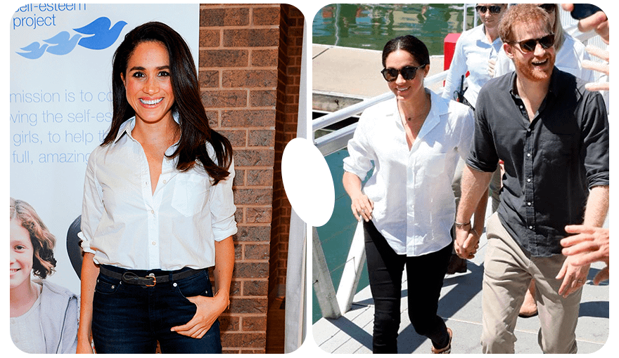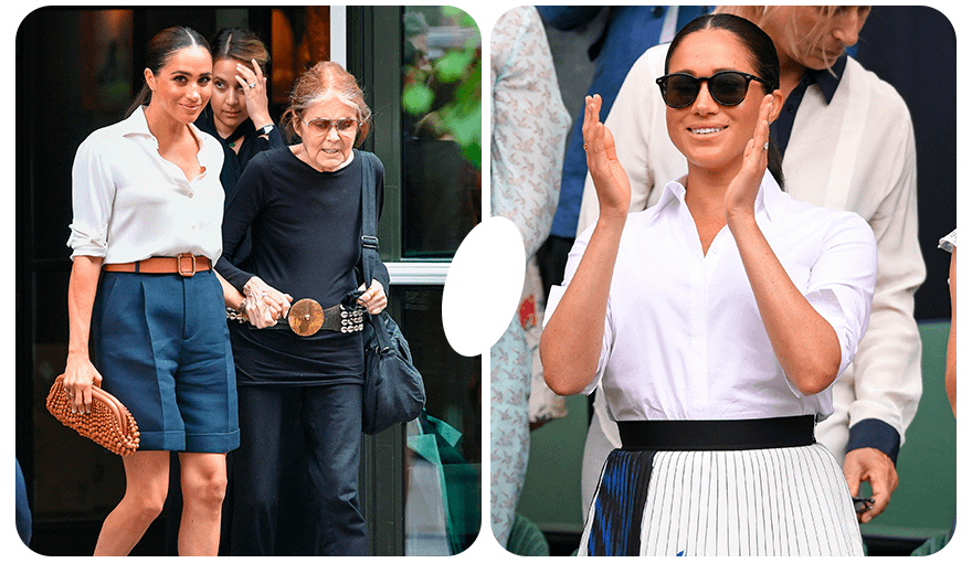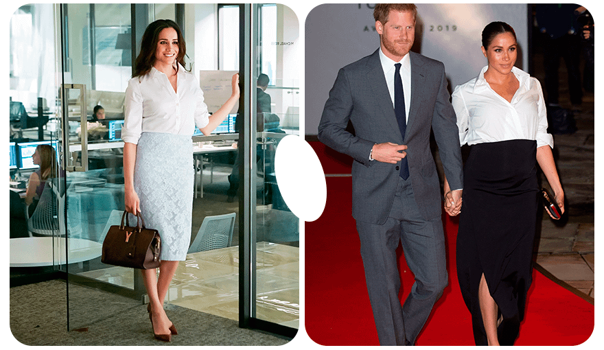 Королевский протокол не поощряет образов с юбками до колен. И Меган, еще не будучи членом королевской семьи, старалась строго следовать этому правилу. К счастью, белые рубашки отлично сочетаются с юбками длины миди или в пол.