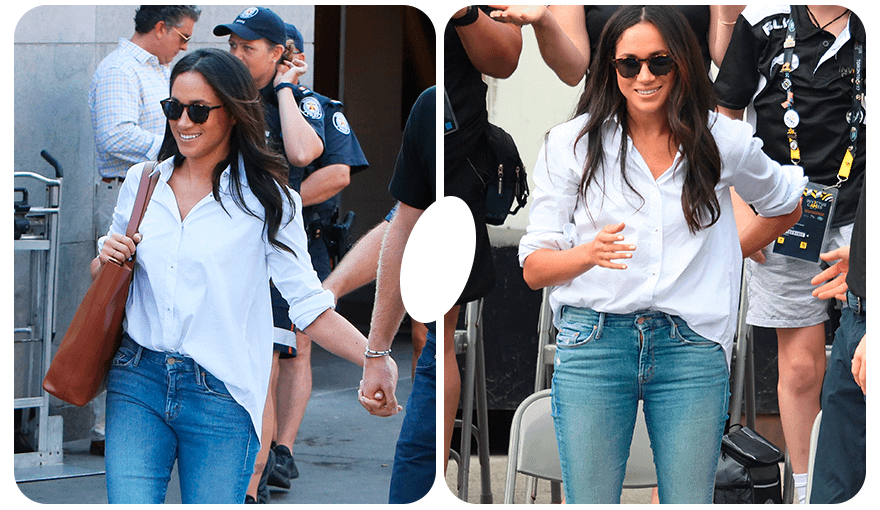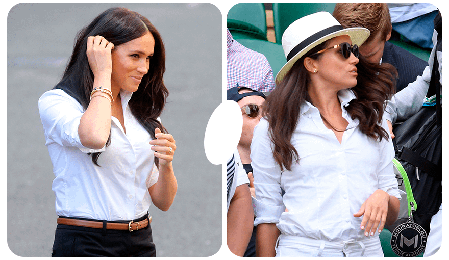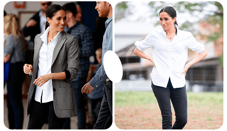 Во многих образах Меган закатывает рукава так, чтобы они доходили до локтя. Чтобы повторить такой образ, необходимо расстегнуть пуговицы на манжетах и подвернуть их так, чтобы ткань из-под них не выглядывала. А затем подворачивай рукав, соблюдая половину или полную ширину манжета.