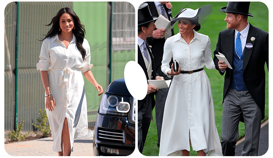 Меган любит не только белые рубашки. Нередко ее можно увидеть и в платьях подобного кроя и того же оттенка. Они выглядят классически, но в то же время эффектно и свежо. Выбирай силуэты с прямой или расклешенной юбкой. А еще стильно смотрится асимметричный край и акцент на контрастном поясе.