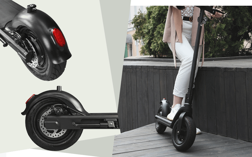 Здесь важно найти золотую середину: колес размером от 3 до 9 дюймов в городских условиях будет явно недостаточно, и ездить на таком самокате с комфортом вряд ли получится: все неровности дороги ты сполна прочувствуешь на себе. Однако выбирать варианты с 14-дюймовыми колёсами и более тоже не стоит — ими будет сложнее управлять, да и в компактности такие модели будут проигрывать. Оптимальным размером считается 10–11 дюймов. К примеру, у Neoline T23 надувные колеса: диаметр переднего колеса равен 10 дюймам (камерного типа), а заднего — 10,5 (бескамерного типа). В совокупности они делают езду мягкой и приятной.