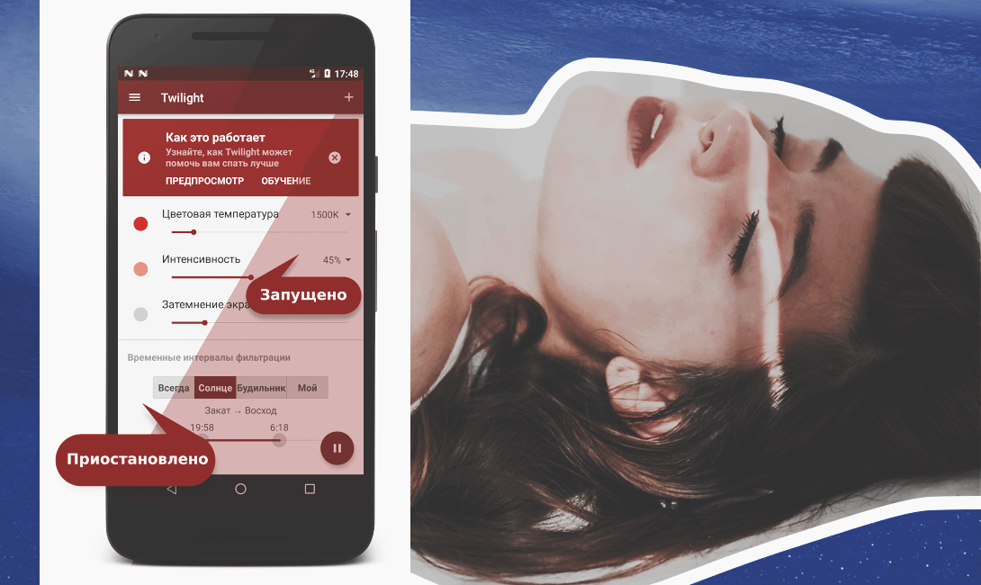 Если ты любишь посидеть в интернете перед сном, тебе следует снизить негативное влияние своих гаджетов. С помощью приложения Twilight ты можешь защитить глаза и подготовить свой мозг к отдыху, настроив экран под вечернее время суток. Голубой свет будет автоматически заменяться на красный, опираясь на время восхода и захода солнца согласно часовому поясу, в котором ты живешь. С этим приложением здоровье глаз и спокойный, непрерывный сон тебе обеспечены. Приложение бесплатно для системы Android.