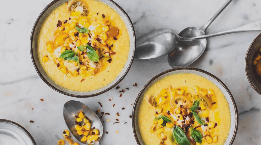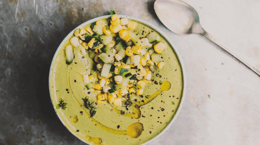 Температура в летнюю жару не всегда вдохновляет на готовку. Однако есть рецепты, которые не требуют много усилий, а на выходе получаются очень освежающими и вкусными. Один из них — крем-суп из базилика с кукурузно-огуречным салатом.