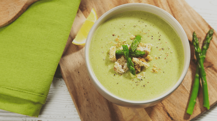 Порциями взбивай суп-пюре в блендере до однородной массы, а после переложи в большую миску или кастрюлю. Добавь сливки и 1/8 чайной ложки молотого черного перца. Накрой и поставь в холодильник минимум на 4 часа, максимально время охлаждения — сутки. Подавать блюдо можно как холодным, так и разогретым. Перед самой подачек добавь лимонный сок и укрась суп двумя стеблями спаржи.