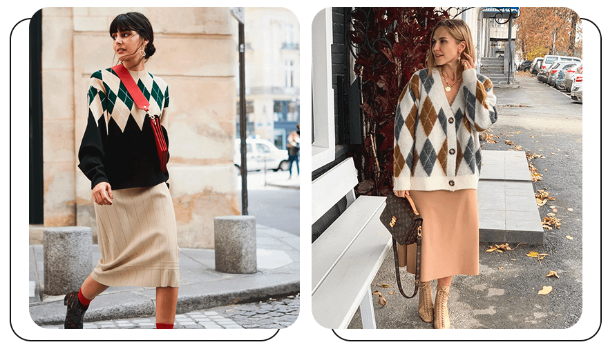 Этот принт получил популярность еще в прошлом осенне-зимнем сезоне, но остается актуальным и в этом году. Одежда, украшенная крупными ромбами, позволяет создать уютный осенний образ. Но чтобы он не выглядел комично, важно обращать внимание на оттенки принта и качество ткани.