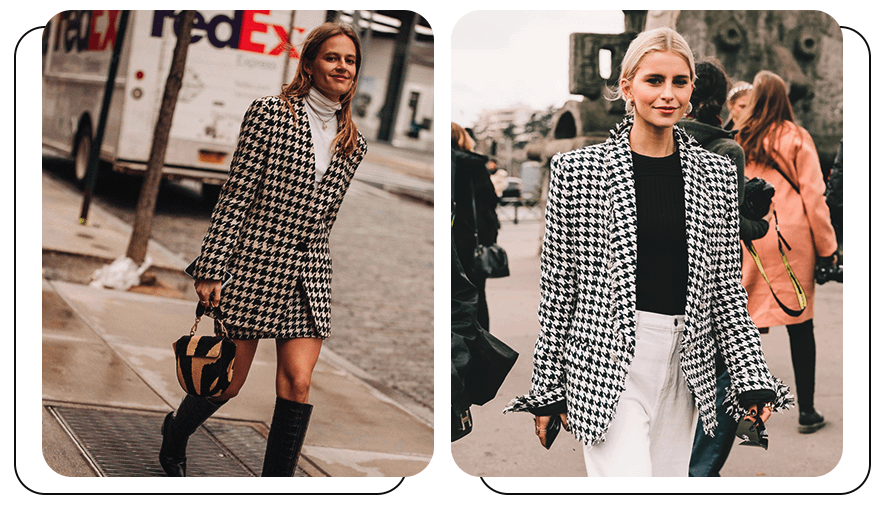 Еще один классический принт, который вновь вернулся в моду, — гусиная лапка. Он используется для создания как верхней одежды, так и блузок, платьев. Одновременно строгий, но необычный принт может выглядеть «шумно», если использовать слишком много его вариаций в одном образе. Поэтому гусиную лапку рекомендуем сочетать с однотонной одеждой. А вот отказываться от ярких цветов не обязательно. Черно-белый принт хорошо смотрится как со спокойными базовыми оттенками, так и с более яркими.