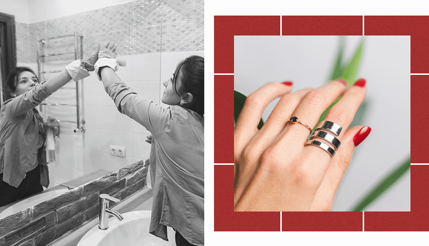 Случайный удар кольцом по столешнице или другому твердому предмету во время уборки может стать причиной его деформации или появления микротрещин. Стоит снимать украшение, даже если убираешь в перчатках.