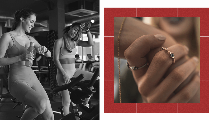 Кольца не стоит носить во время любых интенсивных упражнений от бега до поднятия тяжестей в спортивном зале. Помимо того, что инвентарь, который используешь, может их повредить, есть и другой риск. Ущерб им может нанести и пот, попадающий на поверхность, так как он содержит соль, о негативном воздействии которой мы уже упоминали.