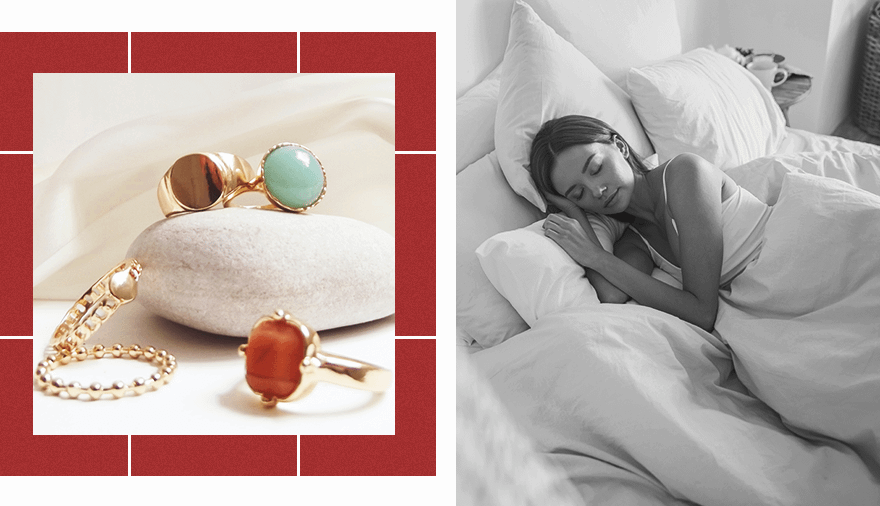 Во-первых, есть риск зацепиться кольцом за посторонние предметы. Например, оно может запутаться в волосах, если часто подкладываешь руки под голову и неспокойно спишь. Нередко кольца цепляются и за пуговицы пижамы. Подобные случаи могут привести к повреждению формы украшений. То же самое может произойти, если ты часто спишь, подложив руки под себя. Деформация кольца происходит со временем, постепенно, но все равно негативно влияет на состояние металла и камней.