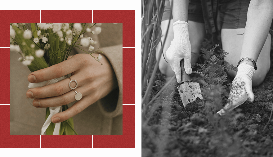 Такие твердые текстуры, как сухая земля и камни, являются абразивными. Они могут привести к тому, что на кольцах появятся царапины или их покрытие местами сотрется. Стоит снимать кольца, даже если работаешь в перчатках, так как крепление камней может зацепиться за их внутреннюю поверхность и со временем стать более шатким.