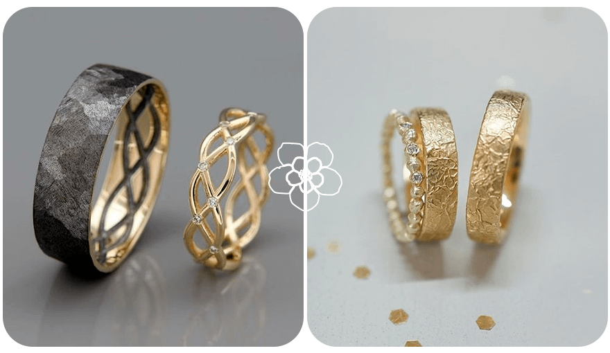Вместо выбора базовых золотых колец, которые можно купить в любом ювелирном магазине, стилисты рекомендуют обратиться к ювелирам и придумать собственный необычный дизайн украшения. Главный тренд этого сезона — обручальные кольца, дополняющие друг друга.