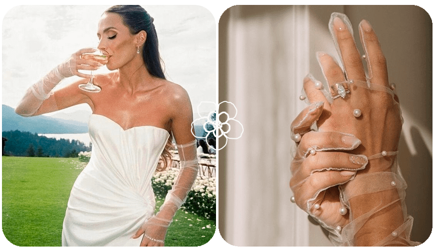 Если хочешь создать яркий и женственный свадебный образ, используй удлиненные белые перчатки. Актуальны модели как из шелка, так и из сетчатой ткани. Особенно гармонично этот аксессуар впишется в образ, составленный с использованием платья простого кроя.