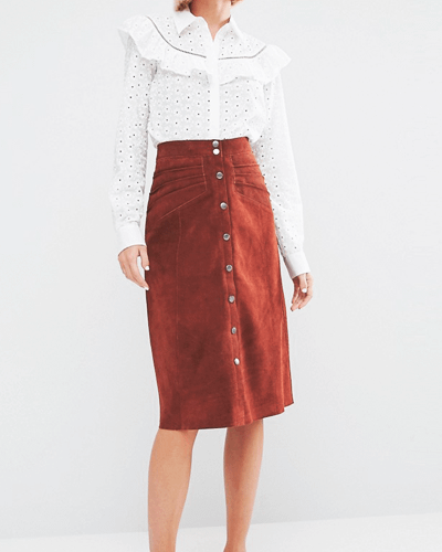 Самым «уютным» материалом из 70-х остаются натуральная шерсть и натуральная замша. Но если вязаные свитера разных фасонов появляются на модной сцене каждый сезон, то замшевая юбка — гость нечастый. Именно она будет популярна зимой 2016-2017 года. Выбирайте не очень строгие и максимально женственные варианты с А-образным силуэтом средней длины, чтобы юбка была не слишком тяжелой, но и коленки не замерзали. Замша при этом должна быть естественных коричневых оттенков – от бежевого до темно-коричневого. Не замерзнуть в такой юбке дополнительно помогут однотонные водолазки, классические свитеры и высокие теплые кожаные сапоги.