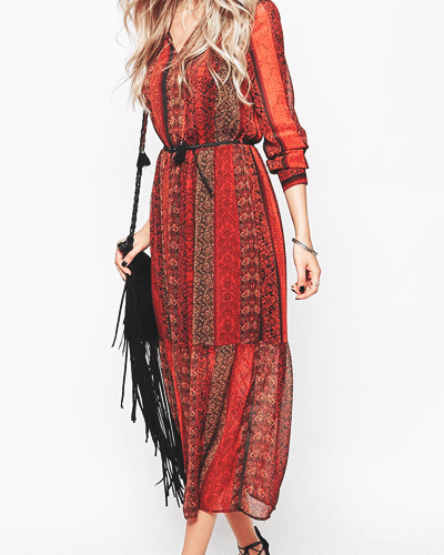 Закрытые платья-макси с длинными просторными рукавами, орнаментальными и цветочными принтами и оригинальными деталями созданы для стиля бохо. Он начал формироваться как раз на заре 70-х годов XX века. Полностью копировать этот стиль не стоит, а вот дополнить такое платье кожаными или деревянными аксессуарами с налетом ретро вполне можно. Кожаная куртка с подкладкой и сумочка или клатч из натуральной кожи тоже будут работать на нежный и стильный образ.
