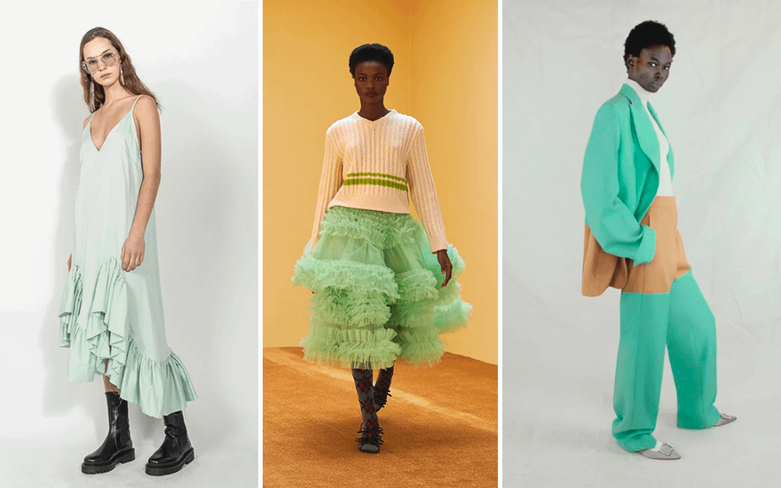 Мятная пастель, которая раньше считалась преимущественно весенним цветом, в этом году заполонила осенне-зимние коллекции. Roksanda представили расслабленный брючный костюм в расцветке мята-кэмел, модель Molly Goddard появилась в свитере и мятной пышной юбке из тюля, а бренд Marques’Almeida показал платье-комбинацию с воланами внизу в пастельном мятном оттенке. Именно такой свежести нам и не хватает в серый и мрачный холодный сезон.