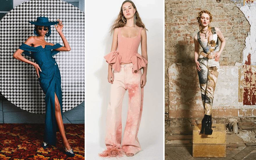 Tolu Coker создал костюм из корсета, длинной юбки и шляпы с принтом «гусиная лапка» в стиле конца 60-х. А Marques’Almeida представил нежный комплект из пудрово-розового корсета и широких джинсов.