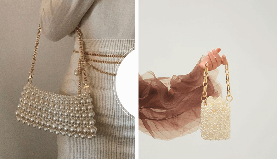 Если тебе этот тренд кажется интересным, обрати внимание на сумки-клатчи из мелкого и крупного жемчуга. Актуальны модели как классических прямоугольных форм, так и цилиндрические, а также круглые. Сочетать их рекомендуем в одном образе с минималистичной одеждой из натурального шелка или с классическими пиджаками и однотонными платьями.
