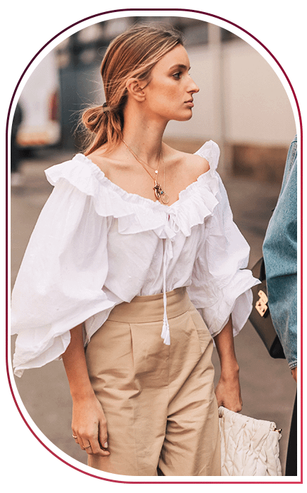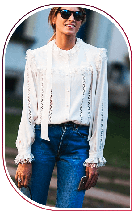 Белоснежные викторианские блузы с кружевом и каскадами оборок также отлично вписались в современную моду. Их дизайнеры рекомендуют миксовать как с классическими брюками с высокой посадкой, так и базовыми джинсами.