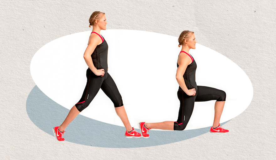 - Ширину шага регулируй так, чтобы задняя нога едва касалась коленом пола, а опорная стояла в сгибе под прямым углом.
