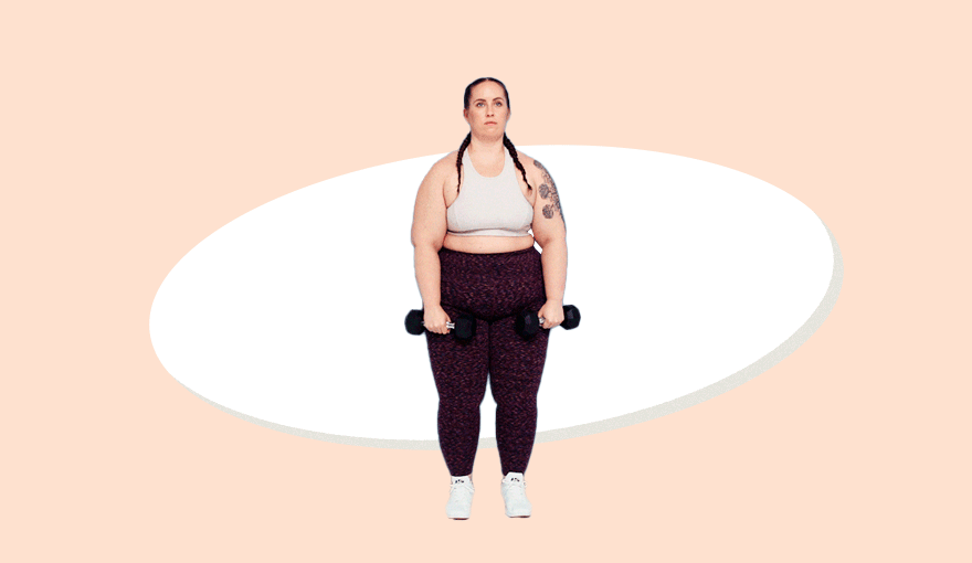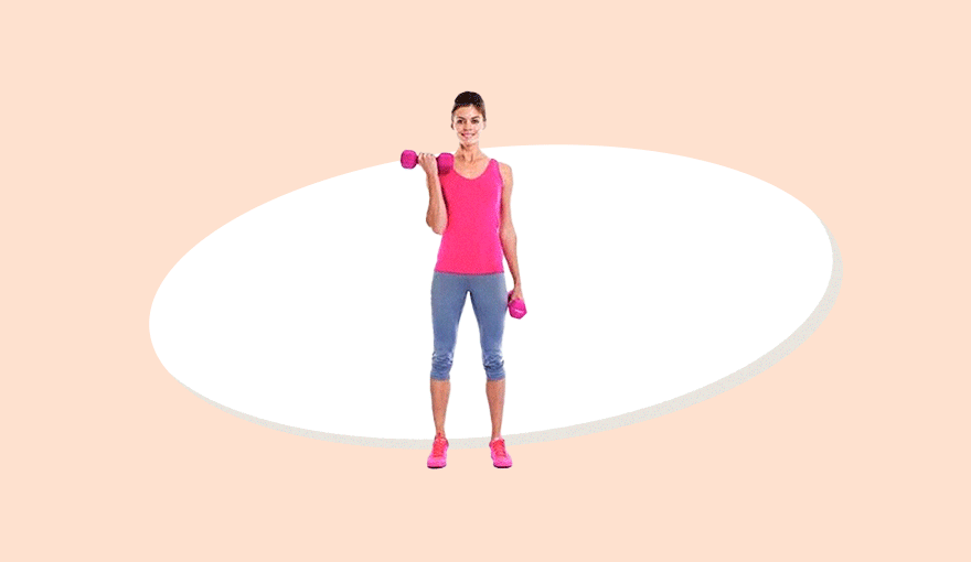 - Возьми по гантели в каждую руку и согни их в локтях так, чтобы ладони были чуть выше линии плеч.