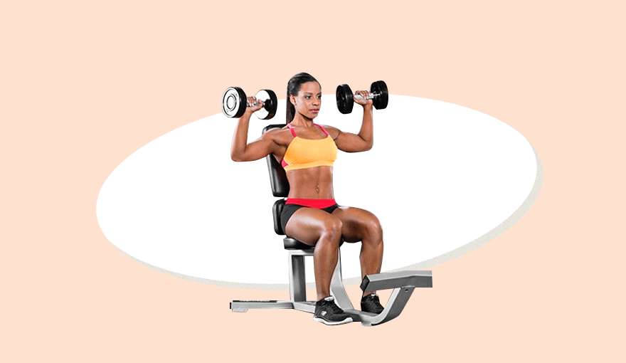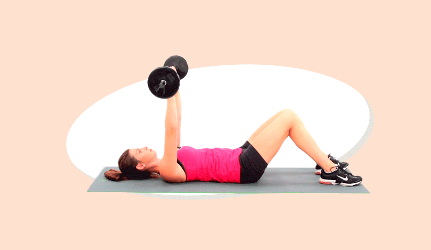 - Подними гантели так, чтобы руки вытянулись прямо над головой.