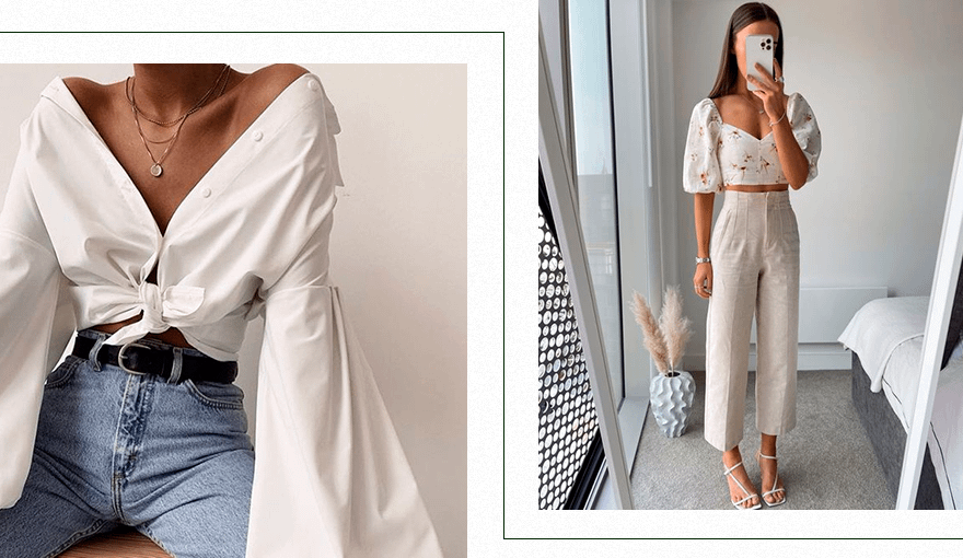 Чтобы образ смотрелся органично и имел красивый акцент на талии, выбирай укороченный верх. Например, топы, футболки и блузки, которые открывают часть торса в области ребер, или модели, которые на 2-3 см выше, чем ремень брюк. Также обрати внимание на рубашки, которые завязываются на поясе — они смотрятся эффектно и подчеркивают талию.
