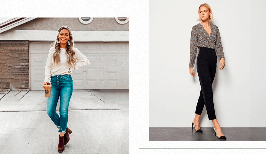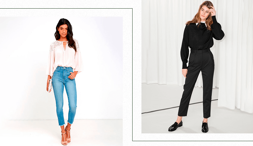 Но если для повседневных образов все же предпочитаешь обувь без каблука, обязательно обращай внимание на длину брюк и их фасон, чтобы не показаться ниже, чем ты есть. В этом случае стоит выбирать облекающие модели и сочетать их с лоферами, балетками или босоножками.