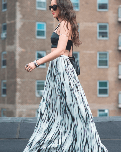 Длинная легкая юбочка — вихрь, если покружиться на месте — чаще всего появлялась на красных ковровых дорожках в качестве изысканного наряда для торжества. И это действительно удачный вариант, так как она идет всем и скрывает множество недостатков фигуры, подчеркивая талию и строя прекрасный женственный силуэт у всей фигуры. Как и в случае с рубашкой поло — лучше иметь в гардеробе сразу несколько цветовых вариантов, возможно, слегка разных по покрою. Темный и насыщенный (шоколадный, чернильно-синий) для торжественных мероприятий, светлый (грушевый, розово-бежевый) — для летнего гардероба и один яркий цвет (можно даже блестящий или золотой) для создания акцента.